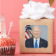 American President Joe Biden White House Photo: The photograph captures a moment in time during the Presidency Joe Biden the 46th President of the United States. Sunlight streams through a window, casting a warm glow on the figure of an Biden standing confidently in the centre of the frame. Standing tall with arms straight, a gesture that suggests both authority and a hint of casual ease. --- Mr. Biden is dressed impeccably in a dark suit, the crisp fabric contrasting sharply with the clean lines of his white shirt. A blue adds a touch of personality to the ensemble. --- A glimpse of patriotism is evident in the background. An American flag stands proudly on a pole to the man's left, its vibrant colours a subtle counterpoint to the cool blue of the wall behind him. --- Reelection soon to come for President Biden is the focal point of the image. His short white hair frames a kind face, etched with the lines of a life well-lived. A warm smile plays on his lips, conveying a sense of confidence, wisdom, and perhaps a hint of amusement.