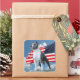 A proud blue and white Pit bull (American Staffordshire Terrier) standing in front of a waving American flag and blue sky.