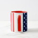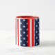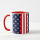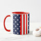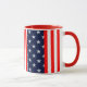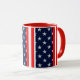 This custom coffee mug features a design that displays the Stars & Stripes of the American flag print with a red, white, and blue coloured with an all over print style in this pride of the USA theme. The rim & handle are glazed in matching colours available in 11-ounce or 15-ounce sizes microwave and dishwasher safe ceramic construction.