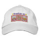 Fun embroidered Patriotic hat with American symbols bordered in red and white stripes and gold stars on blue at corners. Apple pie, baseball and hot-dogs with text above saying American As: