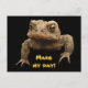 A grumpy looking American Toad (Bufo americanus) is looking out at you from the front of this postcard. This small amphibian is brown with black, gold olive green and orange coloration. His warts distinguish him from his frog neighbours. Although hatched in the water of ponds, rivers, lakes or streams, the tadpoles soon move to land where the toads live their adult lives. His startling call is a long screech. He looks quite fierce but is actually a gentle little guy who eat lots of garden pests including insects and slugs. The text reads: Make my day ! It can be customised or removed.