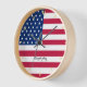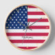 The all American, Stars and Stripes, Old Glory, Star-Spangled Banner, USA flag, custom, personalised, acrylic round wall clock with high-impact plexiglass crystal face and natural wood frame, for your room, home, office, to show your pride, patriotism, love. To customise, simply enter your name / family name / company name or your initials / monogram. Great home & office decor for Independence Day 4th of July parties, Memorial Day celebrations, armed forces celebration, and more. Makes a great patriotic gift for fathers day, birthday, wedding, independence day, memorial day, anniversary, christmas, holidays, and more, for your loved ones, mum, dad, brother, sister, son, daughter, husband, wife, bride, groom, grandpa, grandma, family and friends.
