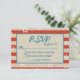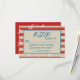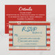 A rustic Americana RSVP card for a patriotic or July fourth wedding. Antique red and blue set off this colourful invitation. The front of the card's background is a burlap texture with red and off-white stripes and white stars. Includes a details card on the back