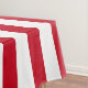 Americana red and white wide striped celebratory patriotic 4th of July tablecloth.