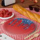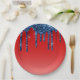 A bold and eye-catching background featuring a sparkling blue glitter drip cascading over a rich red gradient background. The shimmering texture adds a festive, celebratory feel, while the classic red, white, and blue color palette evokes Americana pride. Glitter drips are simulated in the artwork.