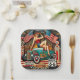 A classic-style photograph of a stunning woman in a short, elegant white dress, striking a seductive pose next to a glossy red convertible sports car.