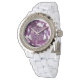 Women’s rhinestone white enamel watch with an image of a dazzling amethyst. See matching button, charm, drop earrings, keychains and necklace. See the entire Gemstones & Medallions Watch collection in the ACCESSORIES section.