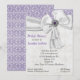 Beautiful lavender and white coloured bridal shower invitation, with a white lace like design, over a ivory coloured background. A lavender background, with white lace overlay, at the top of the invitation and the reverse side. Graphics of a white ribbon and bow, at the top, is decorated with a pretty silver tone and amethyst like jewel. Personalise all the text to suit your special event. Lovely keepsake invitation the bride to be will love.