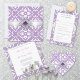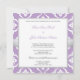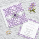 This wedding invitation showcases a lavender damask floral design with a white lily motif from the Art Nouveau era, symbolizing love and romance. Perfect for a stylish and romantic celebration, it’s enhanced by a silver ribbon that adds a touch of elegance and ties together the details of your love story. A subtle sparkle from a faux amethyst gemstone makes this piece truly stand out.