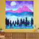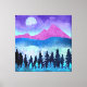 An abstract landscape with unique colours and textures showing a mountain scene with trees and misty fog in shades of purple, blue, teal, and cyan.