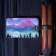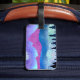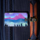 An abstract landscape with unique colours and textures showing a mountain scene with trees and misty fog in shades of purple, blue, teal, and cyan.