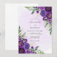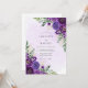 This design showcases a vibrant arrangement of amethyst and plum-colored roses paired with lush ranunculus blooms. Delicate sage green eucalyptus and fern-like greenery surround the composition against a soft lavender watercolor backdrop. The romantic botanical aesthetic creates an elegant atmosphere perfect for a seasonal outdoor or indoor ceremony.