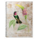 Personalised spiral notebook with a vintage illustration of the Amethyst-throated Sunangel hummingbird - a green hummingbird with a red-violet throat perched on a tropical plant with pink flowers, on an off-white vintage grunge background with gold swirls and floral silhouettes. Great for use as a dream journal, gardening record book or reflective writing. Perfect gift for hummingbird lovers and nature enthusiasts.