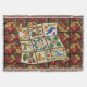What a bonanza for quilting fans! The original digital painting by Leslie Sigal Javorek featured on this blanket begins w/ an Amish Wedding-Ring pieced quilt design using plaid patterns in autumn shades of olive green, red, maize, & rusty brown. Laid across this base is a smaller 9-block traditional story-telling quilt w/ multi-coloured appliques on raw muslim.