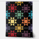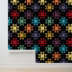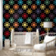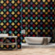 Give any room a homespun look. This peel and stick wallpaper is patterned to look like an Amish quilt with an Ohio Star quilt block print in red, purple, blue, yellow, gold, orange and green set against a black background. This large scale print will add bold colour to your room.