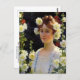 A fine art postcard with the painting by Charles Courtney Curran (1861-1942) an American Impressionist artist, titled Among the Hollyhocks (1904). A portrait of a young woman in a white dress with auburn hair surrounded by yellow and red hollyhock flowers.
