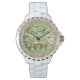 Painting of a yellow angel with the word "Amor". The Spanish word for love, "Amor", is painted in shades of pale yellows with blue and green accents. The acrylic painting has a textural contrast and sparkle from a light layer of glitter. Make customised guardian angel watch designs with your personal messages and/or photos. Use the "customise it" button. The guardian angel art jewellery makes great personalised custom wrist watch gifts!