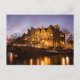 Postcard of Amsterdam canal houses in traditional style next to a bridge over Prinsengracht and Brouwersgracht canals illuminated at dusk during Blue Hour in the Netherlands.