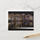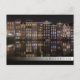 Postcard of traditional architecture canal houses with colourful lights and reflection in the water at night in the Red Light District in the city centre of Amsterdam, the Netherlands with a fading white bar and the text 'Amsterdam'.