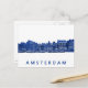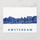 Postcard with traditional canal houses and boats in blue Delftware style on a white background and in blue the text 'Amsterdam'.
