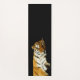 A black yoga mat with a photograph of a sleeping tiger on one side and an awake, standing tiger on the other side.