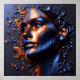 An abstract portrait unveils the beauty of a woman's face, enhanced by an embossed effect that mimics the texture of metal in lines like fins, and shades of dark blue and orange in semi-gloss create a dark mood. Overall an amazing piece of artwork for your spaces.