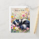 Keep in touch with this sweet postcard featuring an adorable sleepy skunk napping in a bed of pink and yellow flowers.