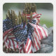An Army soldier's backpack overflows with small American flags featured with Arlington National C.