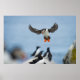AN ATLANTIC PUFFIN COMING IN TO LAND WITH ITS WING POSTER