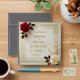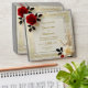 A wedding invitation in gold with a red rose symbolizing love and appreciation, and a white rose symbolizing purity of heart with the guests; customizable.