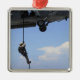 An explosive ordnance disposal technician fast ropes onto the flight deck of the USS Ronald Reagan