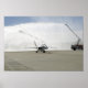An F-18 aircraft taxies beneath the spray from fire trucks featured with F-18.