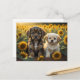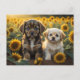 Two puppies, one brown and the other cream, sitting in a serene sunflower field.