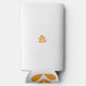 The design features a simple graphic of three orange, abstract shapes arranged in a pattern that resembles a stylised flame or plant. Here’s a detailed description: