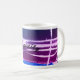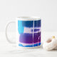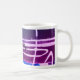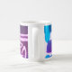 A cute abstract print, with colors of blues and purples, on a classic white mug, with text reading "SERENE~CALM~PEACE"