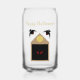 This awesome can glass features a graphic image of a brown nestbox in a clock tower with two red eyed ravens flying towards it, one from the left and one from the right. The Ravens are black and have red eyes. There is also a third Raven hiding inside the black darkness of the nest with only the creepy red eyes showing in the dark. There is a clock above the entrance to the nest with a yellow face and darker roman numerals on it. Instead of 12 at the top there is a 13. The design gets its name from a group of Ravens which is known as an unkindness. There is custom text so you can include your own message. The default message reads "Happy Halloween"