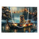 Set sail into the magic of the holiday season with this beautifully detailed illustration, showcasing a proud dog sitting in a festively decorated boat, gliding across a serene Christmas lake. The twinkling lights from nearby pine trees reflect off the water, casting a warm, festive glow that enhances the cosy ambiance. Ornaments dangle from the boat's sides, while glowing lanterns light the way, creating a scene that captures the true essence of Christmas warmth and joy. This nostalgic artwork brings a touch of holiday magic to any space, perfect for those who cherish the spirit of the season.