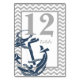 Printed table number card with grey and navy blue anchor and chevron zigzag style design to compliment our wedding invitation set, can be personalised and ordered individually.