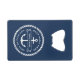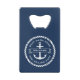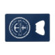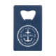 Bottle opener featuring an anchor with a ribbon banner across it with customizable text "welcome". Add your boat name above and hailing port below. Around the anchor and text is a round rope border. White design on dark blue background.