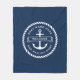 Fleece blanket featuring an anchor with a ribbon banner across it with customizable text "welcome". Add your boat name above and hailing port below. Around the anchor and text is a round rope border. White design on dark blue background.