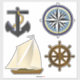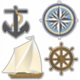 Nautical icons; anchor, compass rose, boat and ship's helm.