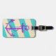This is a luggage tag with a striped background and purple anchor