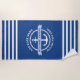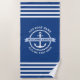Towel featuring a white nautical anchor surrounded by a rope border on a dark blue background. Across the anchor is a light blue banner with customisable text "welcome aboard". Add your boat's name and hailing port.