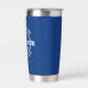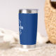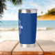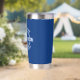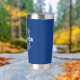 Insulated tumbler featuring a white nautical anchor surrounded by a rope border on a dark blue background. Across the anchor is a light blue banner with customisable text "welcome aboard". Add your boat's name and hailing port.