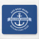 Mouse pad featuring a white nautical anchor surrounded by a rope border on a dark blue background. Across the anchor is a light blue banner with customisable text "welcome aboard". Add your boat's name and hailing port.