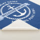 Sherpa blanket featuring a white nautical anchor surrounded by a rope border on a dark blue background. Across the anchor is a light blue banner with customisable text "welcome aboard". Add your boat's name and hailing port.
