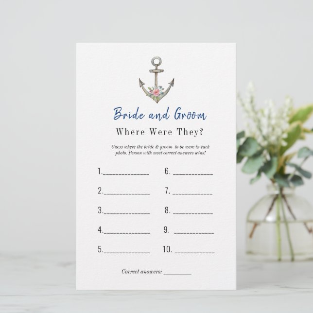 Nautical theme "Where were they" Bridal shower game with hand painted watercolor anchor design. Personalise the back of the card with name of the couple and shower date.