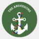 Seal up Christmas cards in nautical style with these personalised envelope seals. The round stickers have an illustration of a boat anchor in white that's wrapped in colourful Christmas lights. These stickers are ready to be personalised with your name above in white lettering against a festive green background.