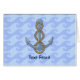 Anchor with rope illustration over waves light blue seamless background. Custom text.