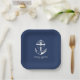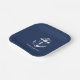 Nautical blue and white wedding paper plates. Great for a Navy (military) or lake house wedding. Design features an anchor wrapped in a banner with text "Anchored in love". Personalise it with your wedding details.